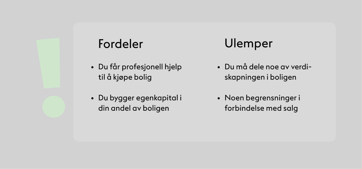 Vi ønsker å hjelpe folk å bli selvstendige boligeiere. Derfor kjøper vi kun bolig sammen med boligkjøpere som har til intensjon å benytte boligen selv som sin primærbolig. Vi kjøper ikke sekundærbolig som er ment for utleie, men vi kan kjøpe boliger som har en hybel eller utleiedel. Inntektene fra dette vil man i så fall beholde i sin helhet som en del av sin totale boligøkonomi.